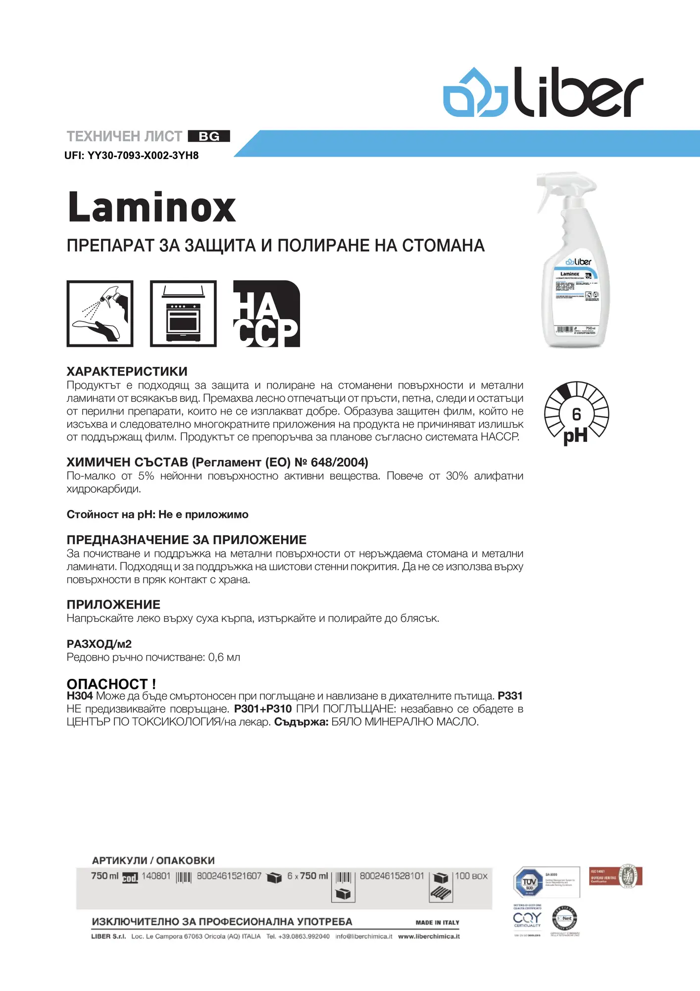 Laminox е отличен избор за професионално почистване, защита и полиране на метални повърхности. Със своята ефективност и лесно приложение, той осигурява блестящи и защитени повърхности, които ще изглеждат като нови за дълго време. Laminox е перфектното решение за професионалисти, които търсят висококачествен продукт за поддръжка на метални повърхности, включително и такива, които отговарят на изискванията на HACCP. Продуктът не само улеснява ежедневната поддръжка, но и удължава живота на материалите, като ги предпазва от замърсявания и износване.