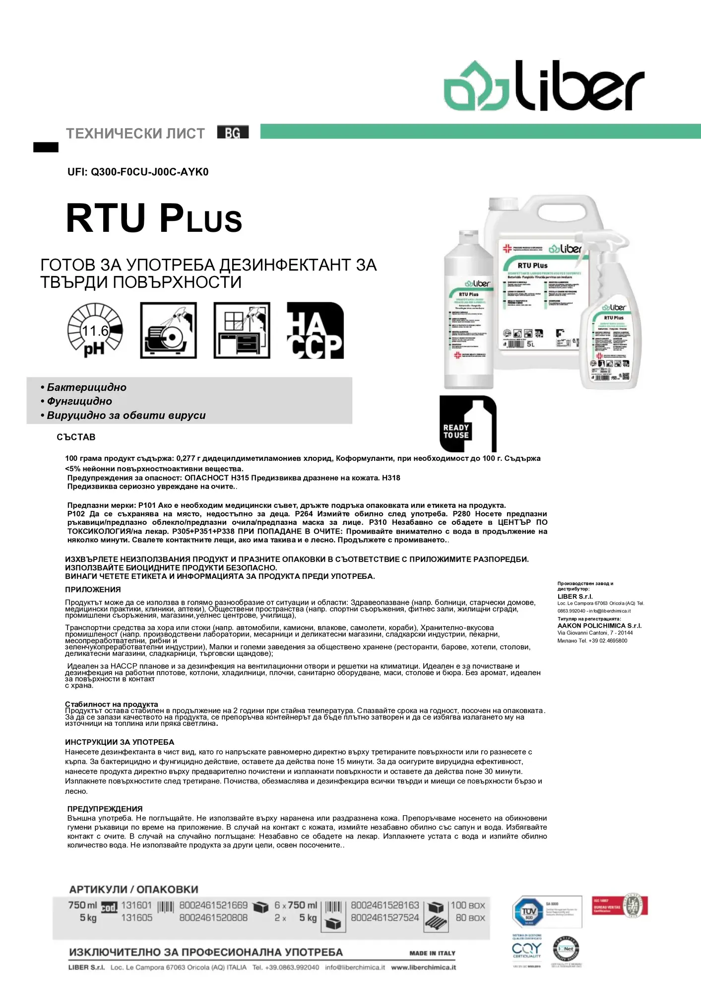 RTU Plus е готов за употреба професионален дезинфектант за твърди повърхности, базиран на DDAC (дидецилдиметиламониев хлорид). Продуктът е създаден за ефективно почистване и дезинфекция в среди с висок риск от микробиологично замърсяване. Благодарение на мощната си формула, RTU Plus осигурява високо ниво на хигиена и безопасност, без необходимост от разреждане.