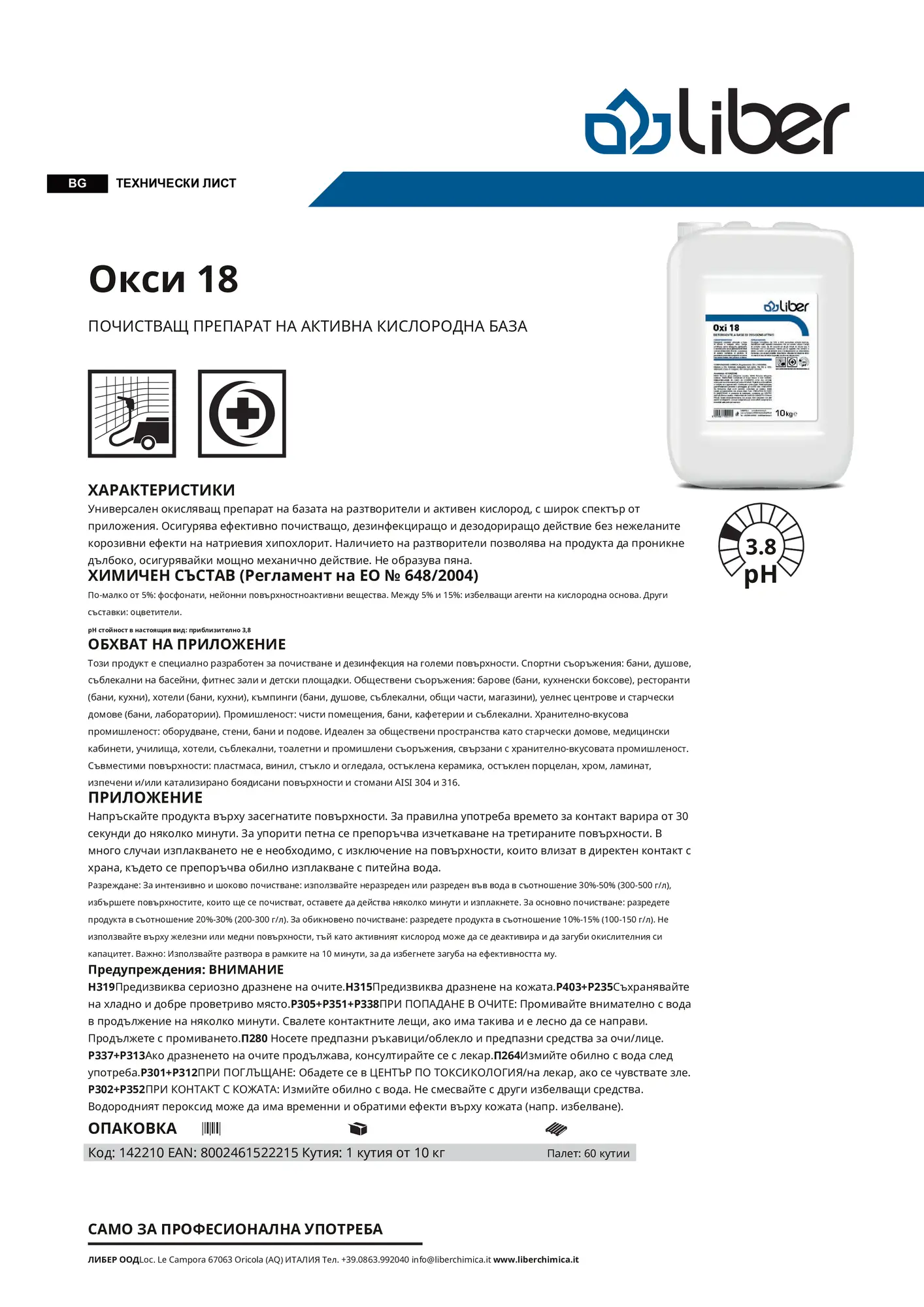 Oxi 18 е универсален окислителен почистващ и санитизиращ препарат на основата на активен кислород, разтворители и водороден пероксид. Продуктът е предназначен за широко приложение в професионални и индустриални среди, където се изисква високо ниво на хигиена без агресивното корозивно действие на натриевия хипохлорит.