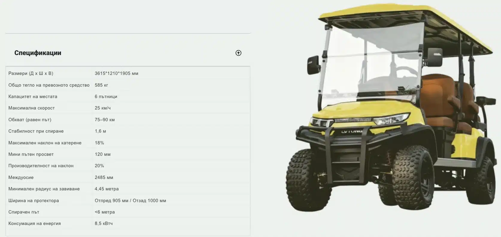 Количката е оборудвана с електромотор 48V / 4 kW, който гарантира плавно ускорение, стабилна работа и безшумно движение. С енергийна консумация около 8.5 kWh и пробег от 75 до 90 км с едно зареждане, моделът предлага отлична ефективност и ниски експлоатационни разходи.