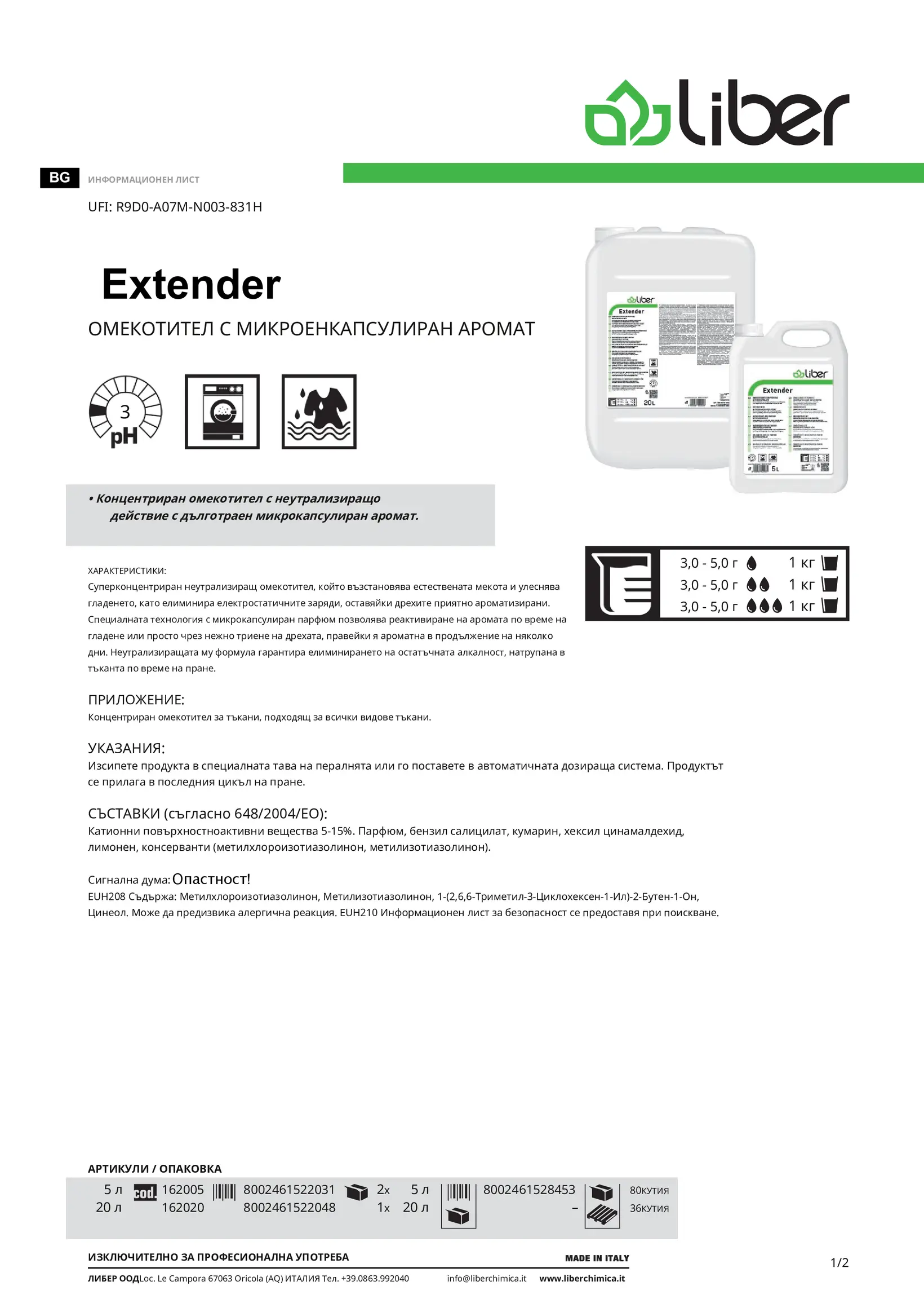 Extender е суперконцентриран неутрализиращ омекотител с микрокапсулиран аромат, създаден за възстановяване на естествената мекота на тъканите и улесняване на гладенето. Продуктът ефективно елиминира електростатичните заряди и оставя дрехите приятно ароматизирани за дълго време.